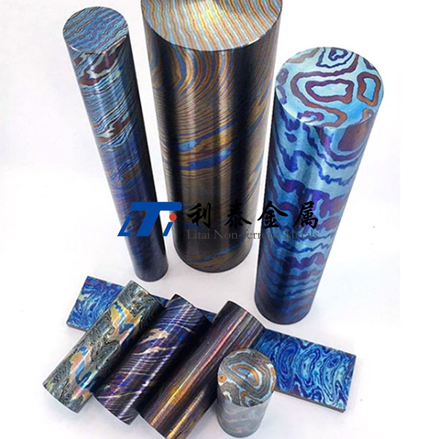 鈦馬士革是由兩種或兩種以上的鈦合金疊鍛而成。然后通過熱處理(鈦燒藍)或者陽極氧化,形成不同的顏色分層的鈦合金材質。