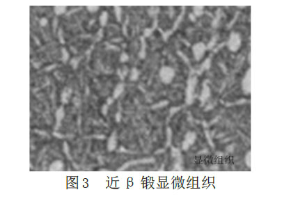 如圖3所示,為近β鍛工藝鍛件的顯微組織。其初生α含量約20%,條狀α沿原始β晶界分布,原始β晶粒尺寸較小,晶界基本破碎,為等軸α+條狀α+β?tīng)畹娜龖B(tài)組織。