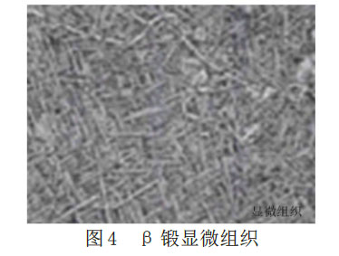 圖4為β鍛顯微組織圖,該顯微組織可以反映相變點(diǎn)的熱變形量,經(jīng)過(guò)研究證明,其在某個(gè)固定溫度可以導(dǎo)致鍛造變形,從而使顯微結(jié)構(gòu)發(fā)生轉(zhuǎn)變。