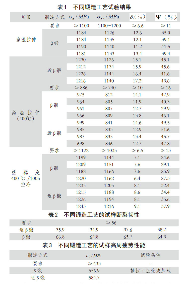β鍛工藝的鍛件強(qiáng)度、塑性及斷裂韌性等綜合力學(xué)性能較好,近β鍛工藝的斷裂韌性較差,因此鈦合金發(fā)動(dòng)機(jī)葉盤應(yīng)選用β鍛造工藝鍛造。