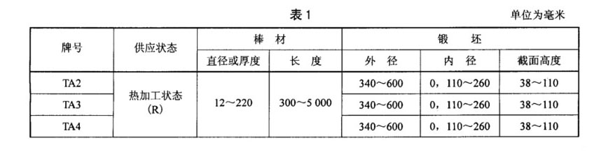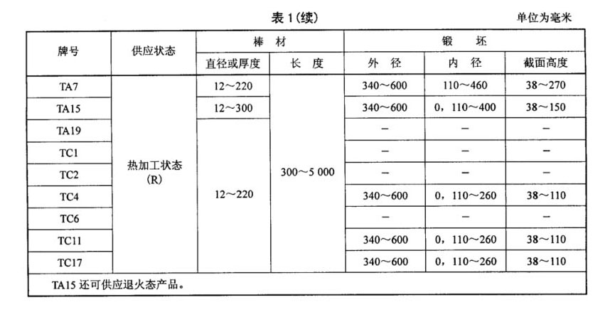 棒材和鍛坯牌號、狀態(tài)和規(guī)格應(yīng)符合表1的規(guī)定。其中TA15鈦合金棒材根據(jù)用途分為兩個(gè)類別: