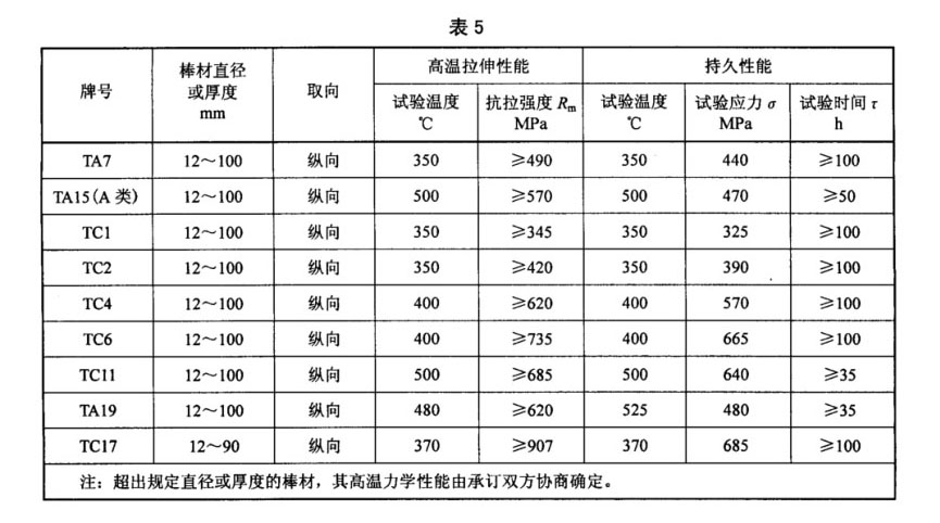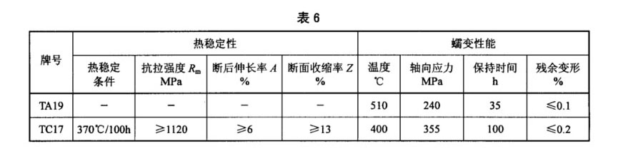 3.4.3 訂購方要求并在合同中注明時(shí),鈦合金棒材的高溫拉伸、持久性能應(yīng)符合表5的規(guī)定,TA19和TC17鈦合金棒材的熱穩(wěn)定性和高溫蠕變性能應(yīng)符合表6的規(guī)定。