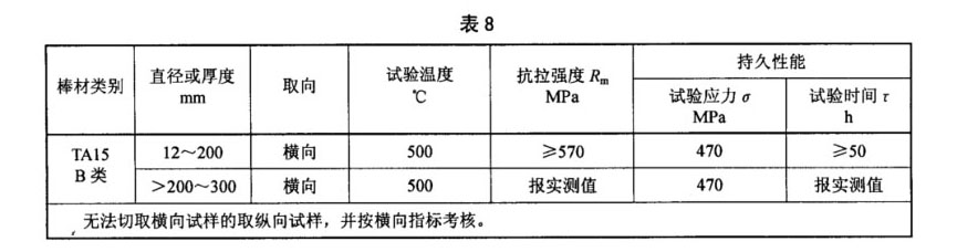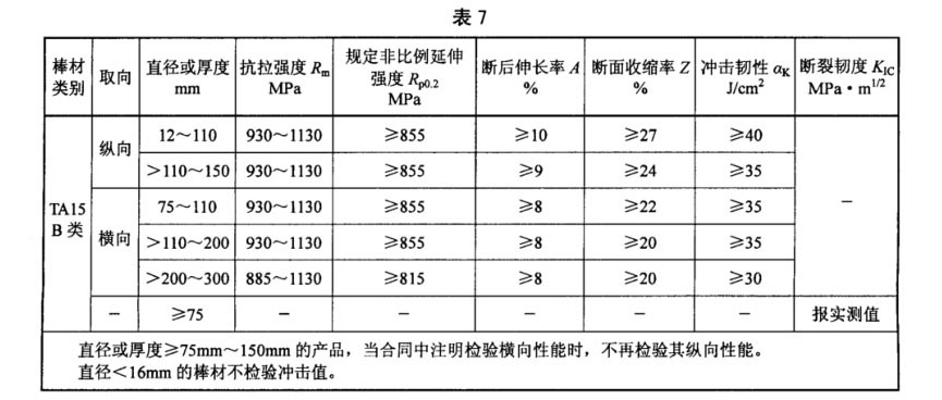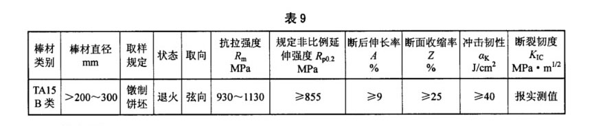 3.4.4 B類用途的TA15鈦合金棒材,其室溫力學(xué)性能在退火態(tài)棒材上或經(jīng)熱處理后的棒坯(一段棒材)上取樣測試。其室溫力學(xué)性能應(yīng)符合表7的規(guī)定,高溫力學(xué)性能應(yīng)符合表8的規(guī)定;當(dāng)訂購方要求并在合同中注明時(shí),直徑大于200mm的棒材應(yīng)取樣鐓制餅坯,餅坯的室溫力學(xué)性能應(yīng)符合表9的規(guī)定。