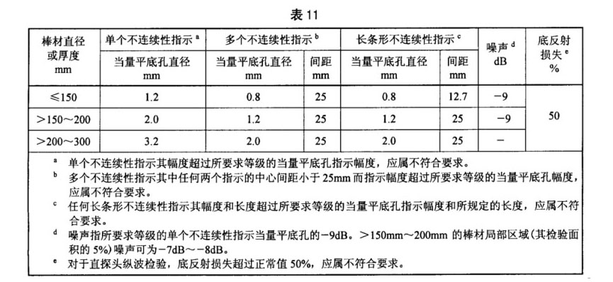 3.6.2 B類用途的TA15鈦合金棒材,應(yīng)按本規(guī)范的附錄A進(jìn)行徑向縱波、周向橫波檢驗(yàn)。徑向縱波檢驗(yàn)允許的缺陷當(dāng)量值見表11,周向橫波檢驗(yàn)不允許存在任何超過人工傷反射幅度的信號。