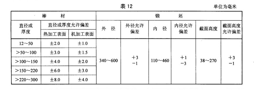 3.7.1 棒材和鍛坯以磨削或機(jī)加工表面供貨。當(dāng)訂購方要求并在合同中注明時(shí),棒材也可以熱加工表面供貨。棒材和鍛坯的尺寸允許偏差應(yīng)符合表12的規(guī)定。
