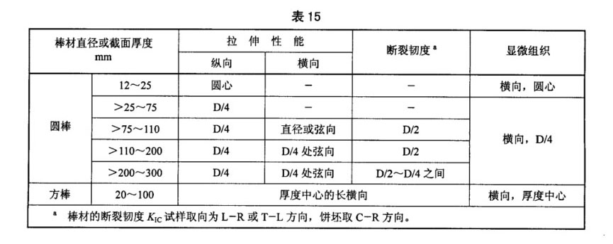 4.2.2.3 B類用途TA15鈦合金棒材的取樣位置還應(yīng)符合表15的規(guī)定,直徑大于200mm的棒材當(dāng)訂購方要求并在合同中注明進(jìn)行鐓制餅坯檢驗(yàn)時(shí),從每根受檢棒材上截取長度為60mm±3mm的毛坯。