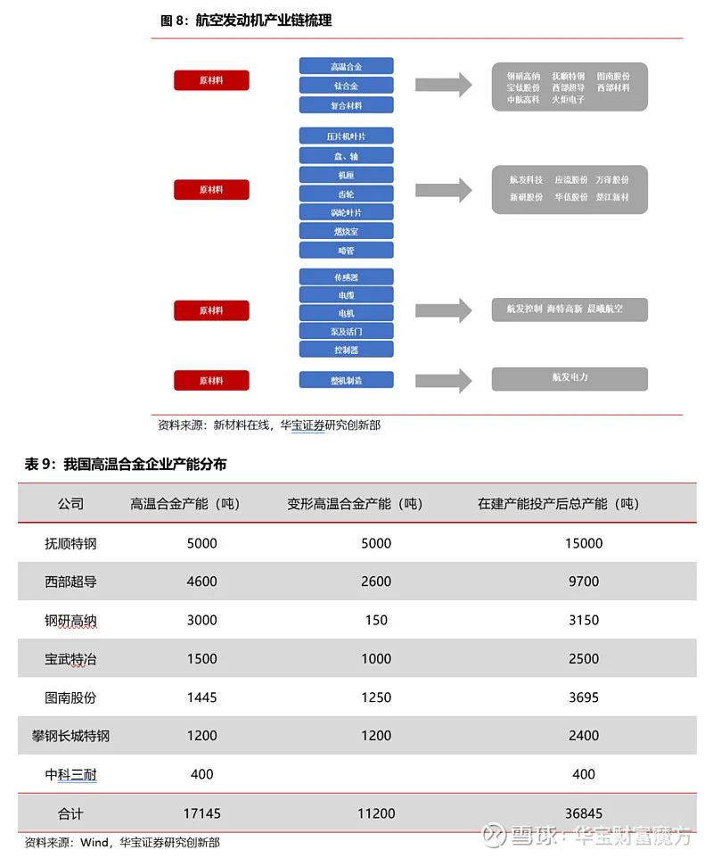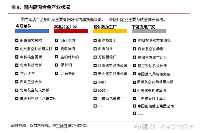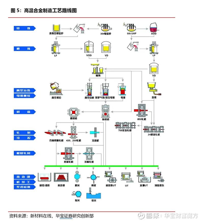 經(jīng)過50多年發(fā)展,我國已經(jīng)形成了比較先進,具有一定規(guī)模的生產(chǎn)基地。結(jié)合產(chǎn)業(yè)鏈各個環(huán)節(jié)相關(guān)參與方來看,目前我國生產(chǎn)廠商集中在航空航天領(lǐng)域用量最大的變形高溫合金冶煉和鍛造環(huán)節(jié),因此在大批量生產(chǎn)高溫合金母合金、板、棒、鍛材上有很大的優(yōu)勢。