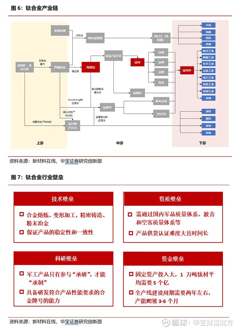 鈦合金的制備工藝較高溫合金簡單,難點集中在海綿鈦和鈦材的制備。鈦材產(chǎn)業(yè)鏈的核心壁壘不在于上游資源和中游冶煉,而是在于鈦材的加工能力,尤其是高端鈦材的研發(fā)能力和制造工藝。鈦合金加工壁壘高筑,導(dǎo)致綜合壁壘亦較高,催生近乎雙寡頭競爭格局。盡管原料金屬鈦價遠(yuǎn)低于鎳,但是基于鈦合金后端加工工藝復(fù)雜,最終部分鈦合金產(chǎn)品價格與高溫合金價格相當(dāng),甚至略高一籌。